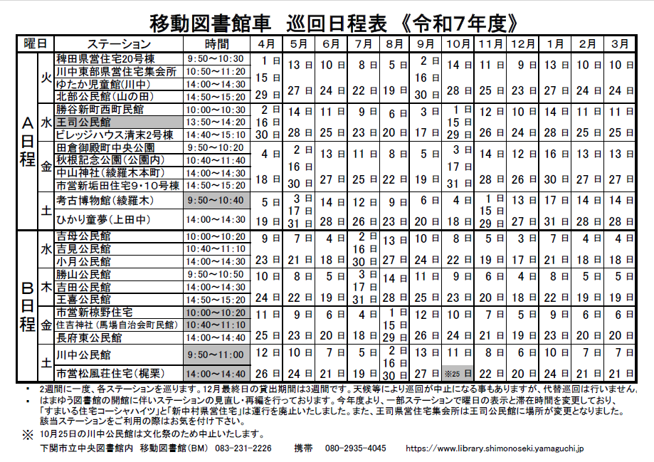 詳しくはR7年度移動図書館年間巡回日程表をご確認ください。